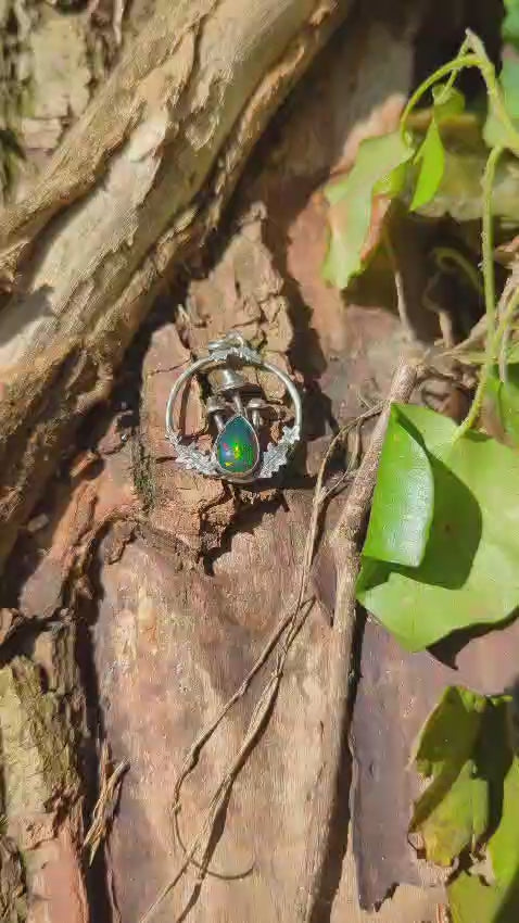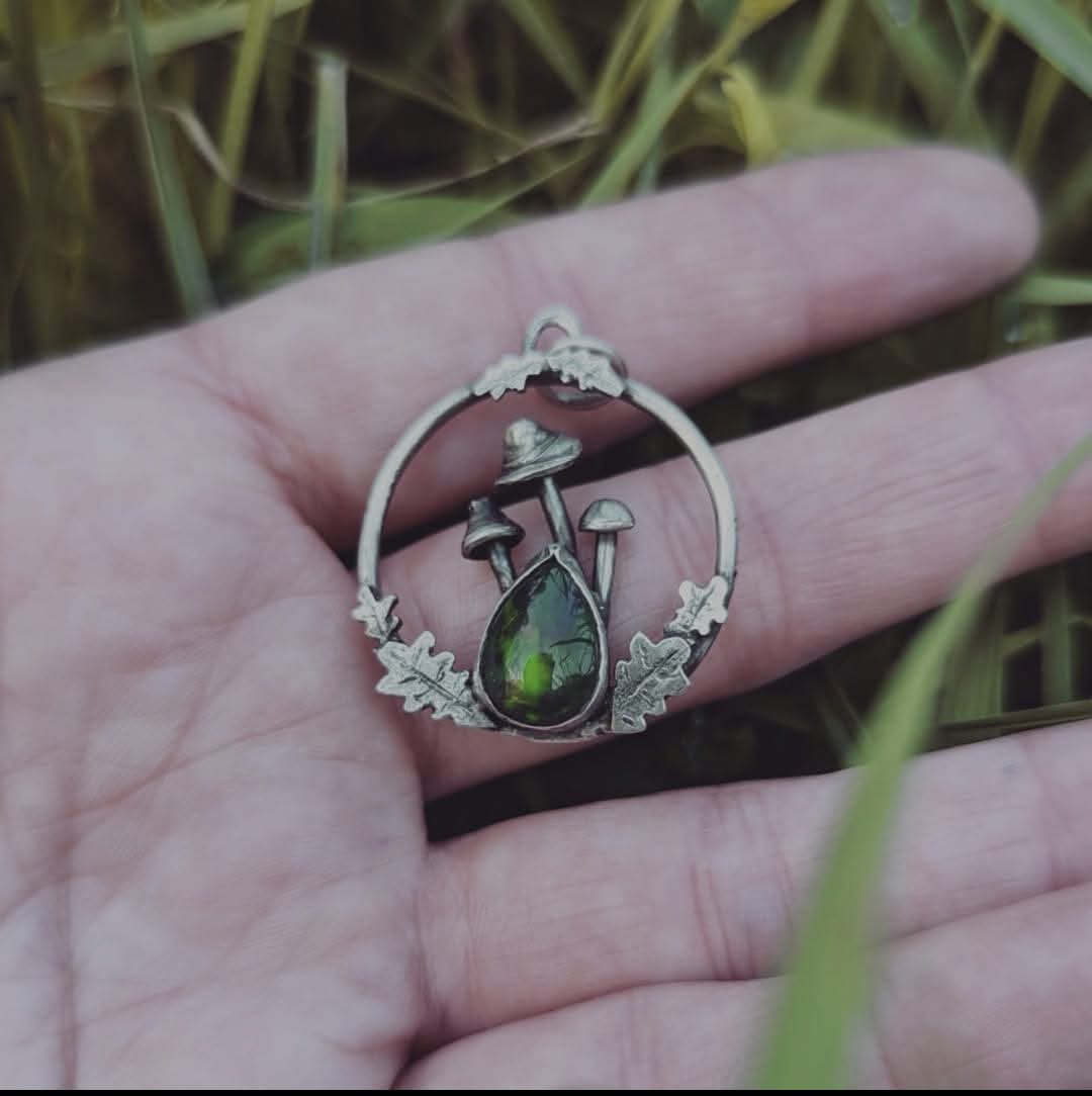I Marasmius Oreades sono la figura protagonista di questo ciondolo, qui contornati da minuscole foglie di quercia e impreziositi da un opale.