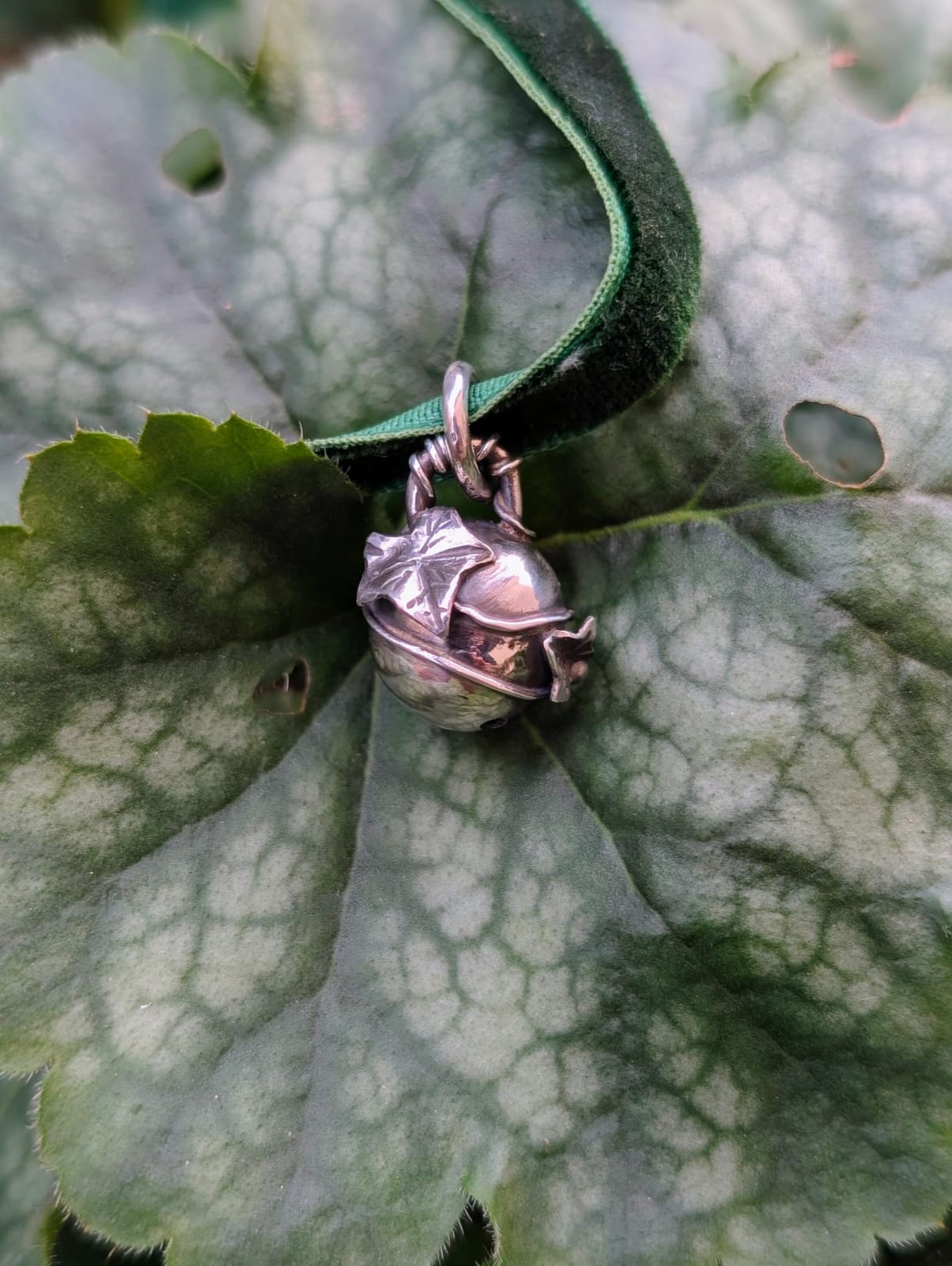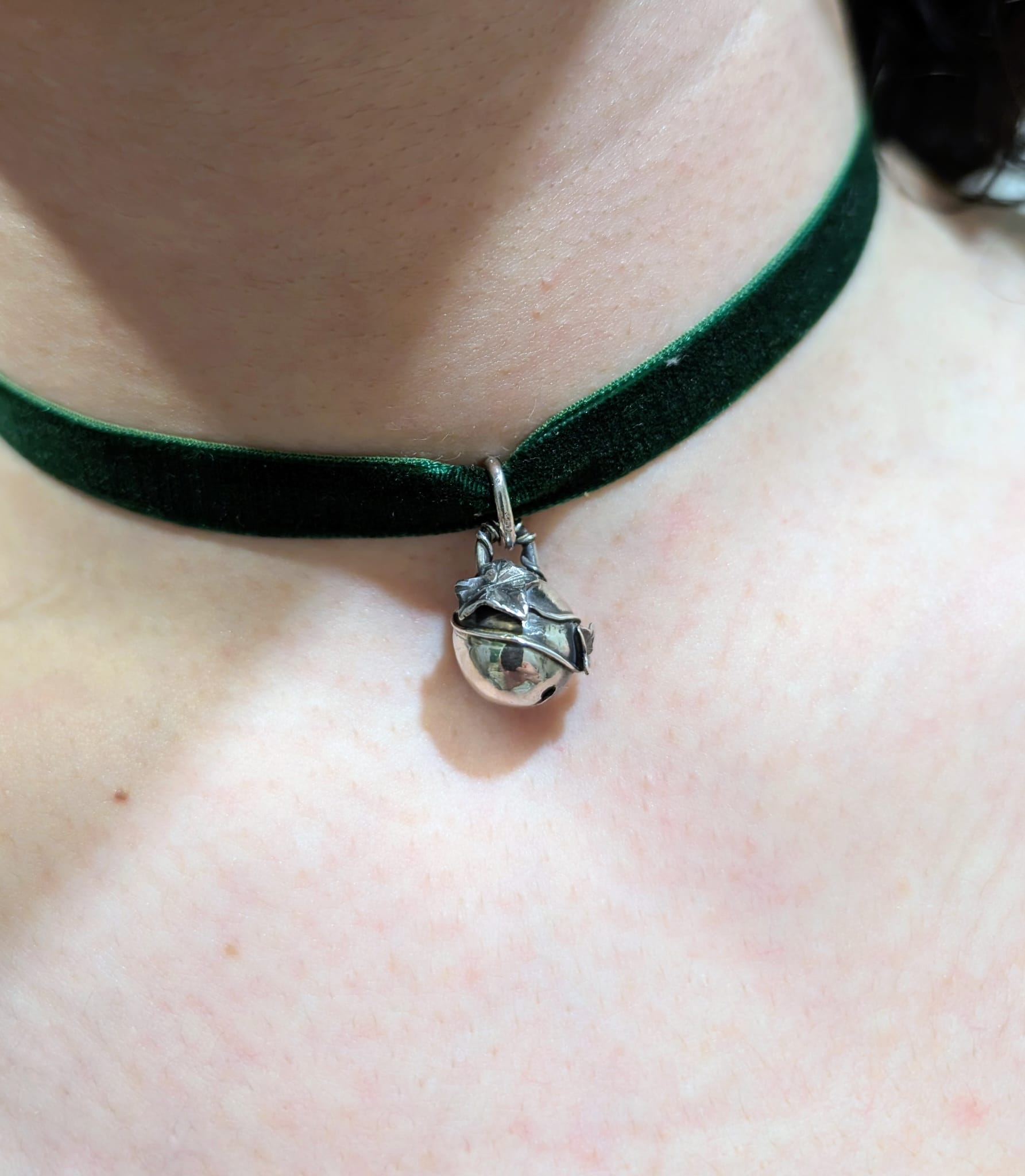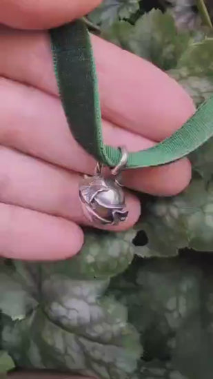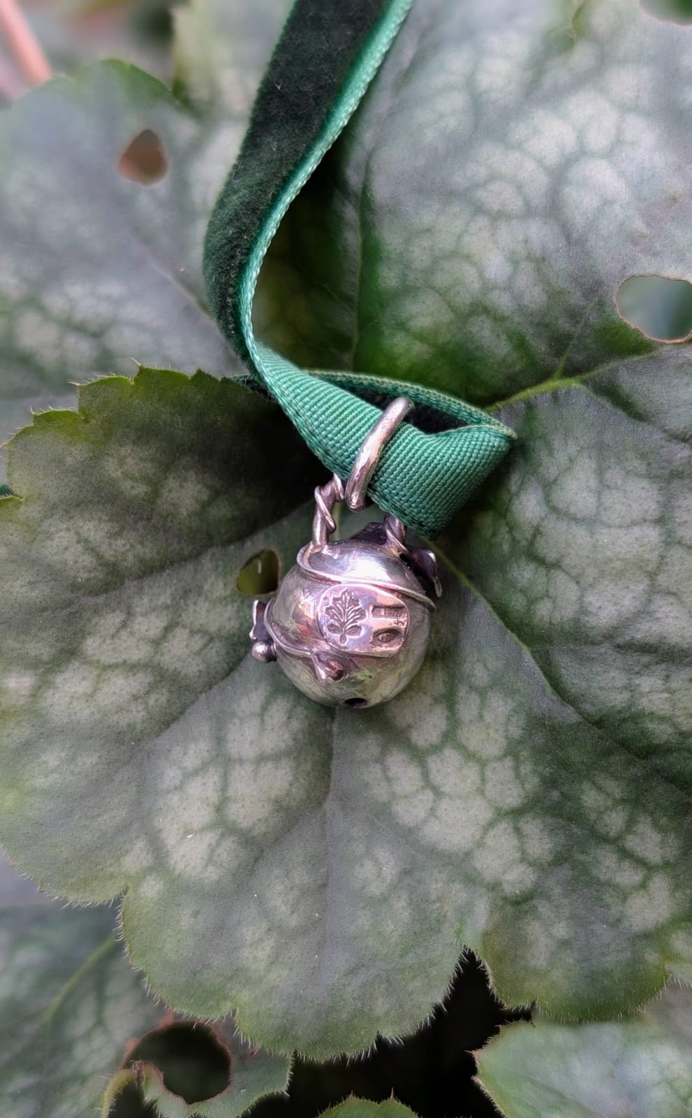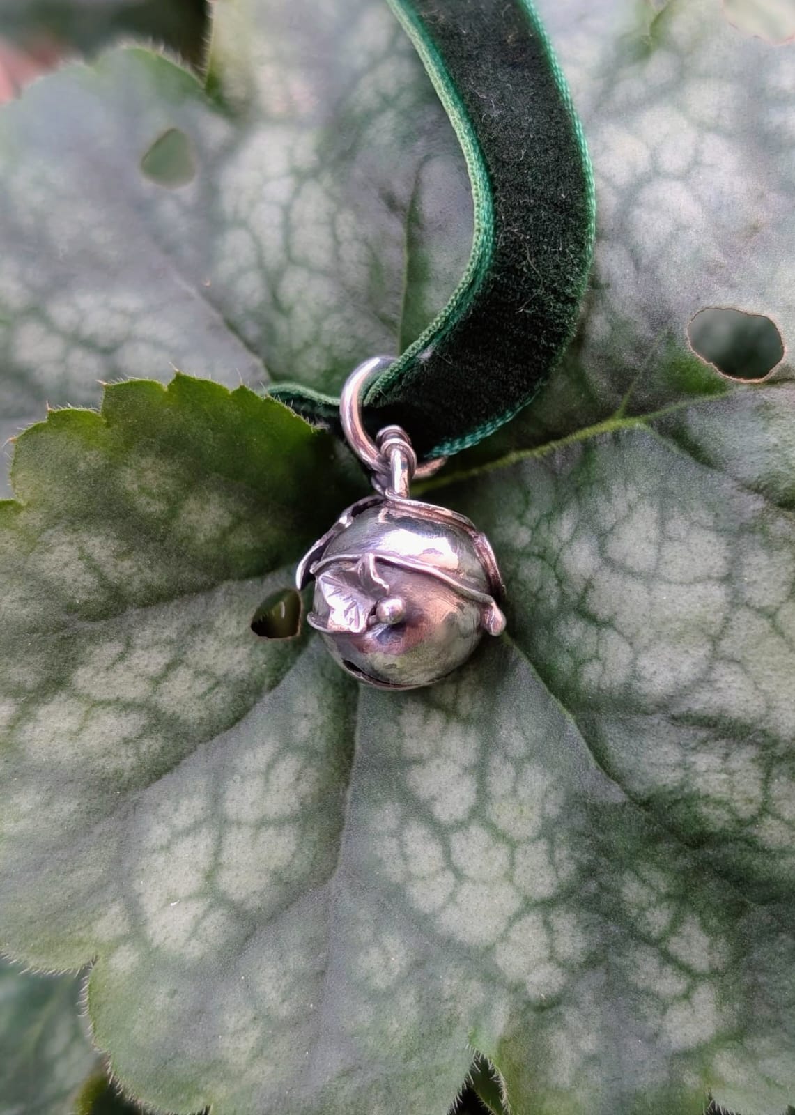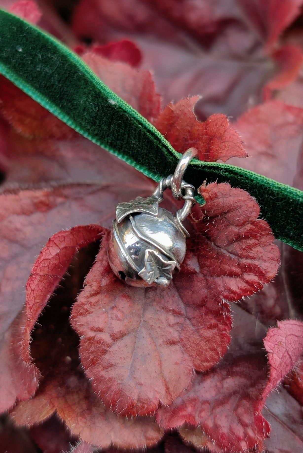 Forgiato dal metallo fuso e modellato con cura, questo piccolo campanello alto 2 cm è avvolto da un ramo d’edera cesellato a mano in argento 925.