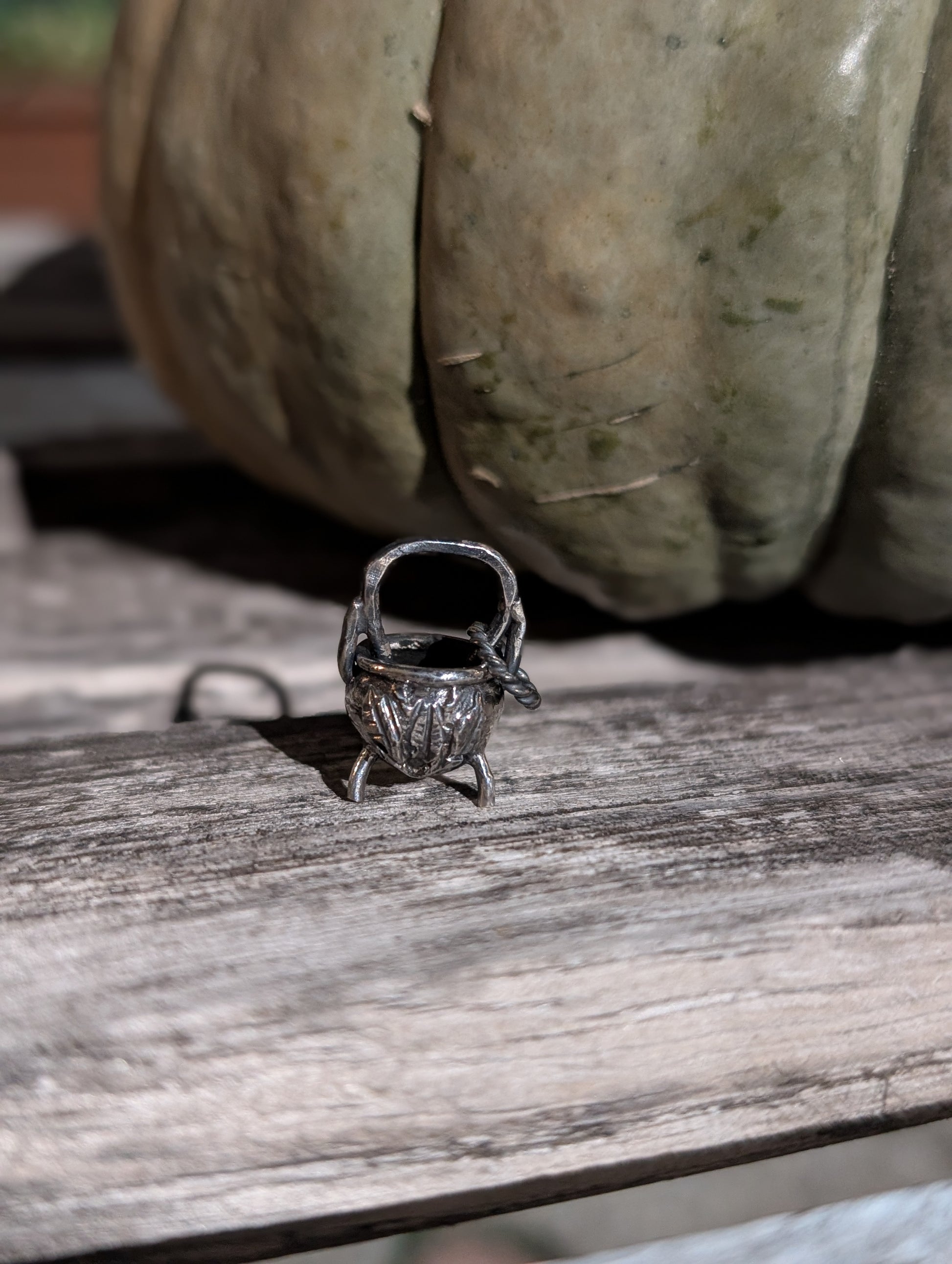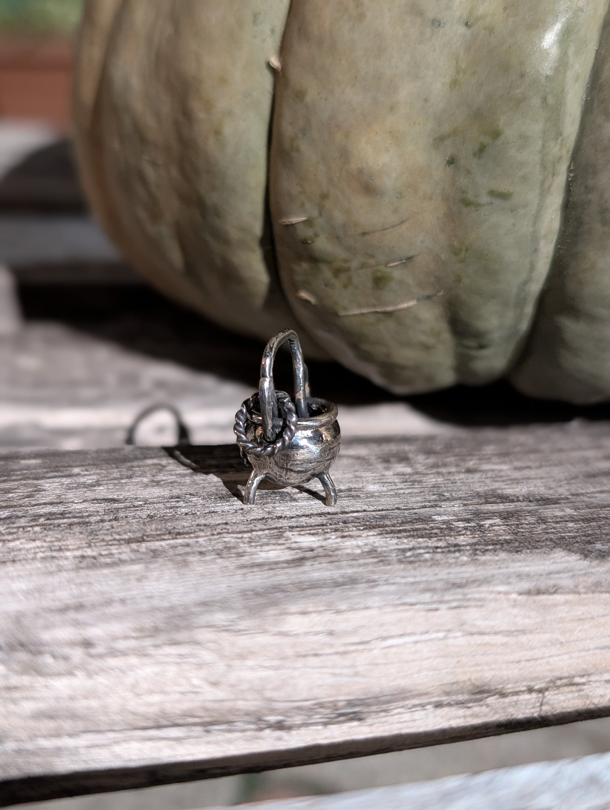 Mini calderone in argento 925, lavorato interamente, modellato da lastra e filo, h 2 cm.