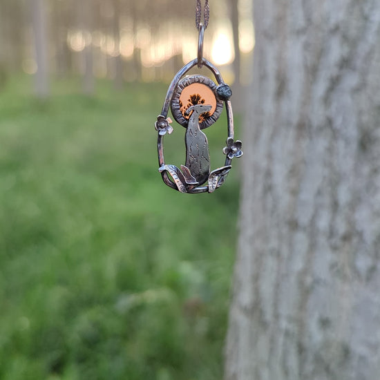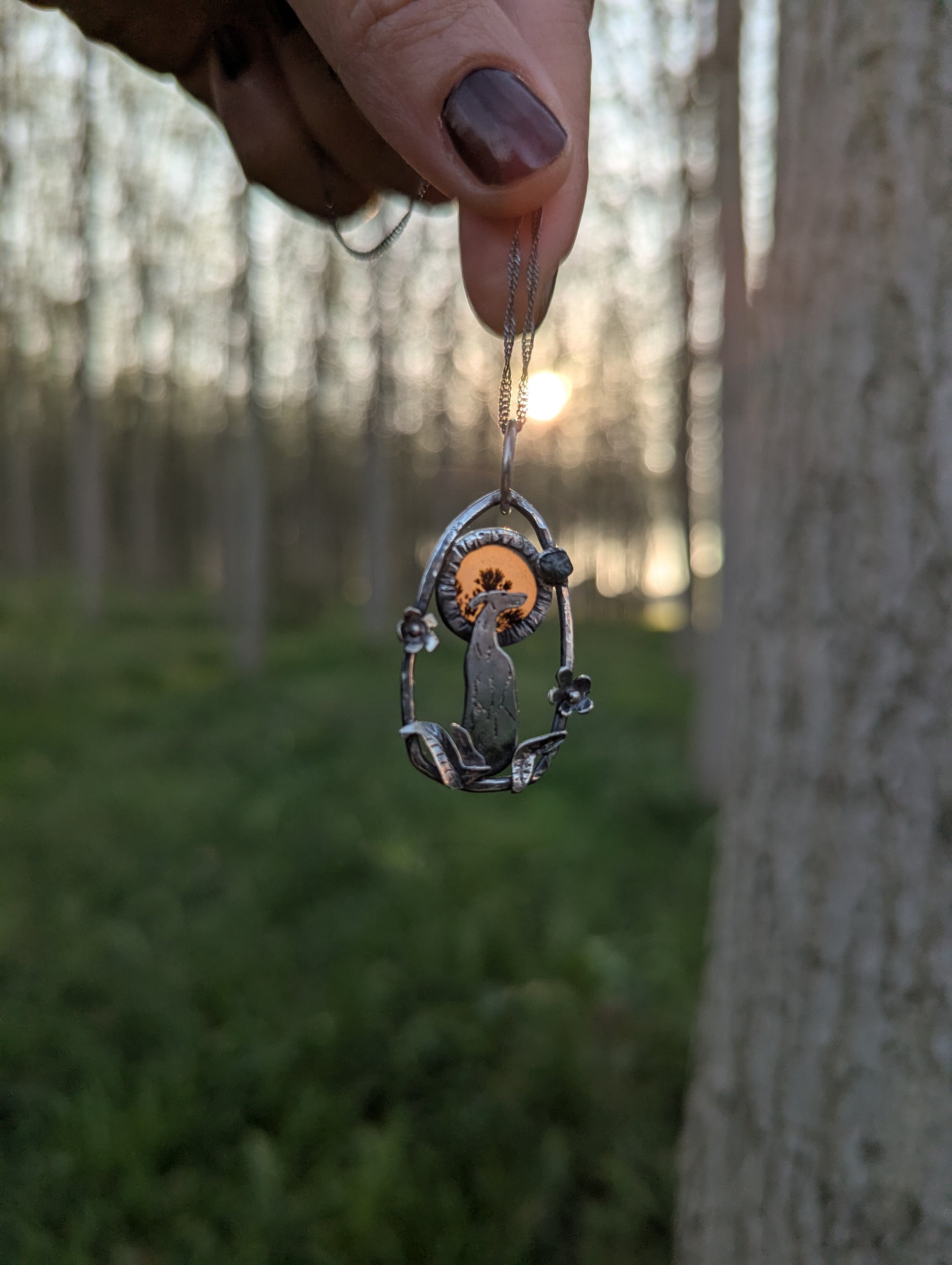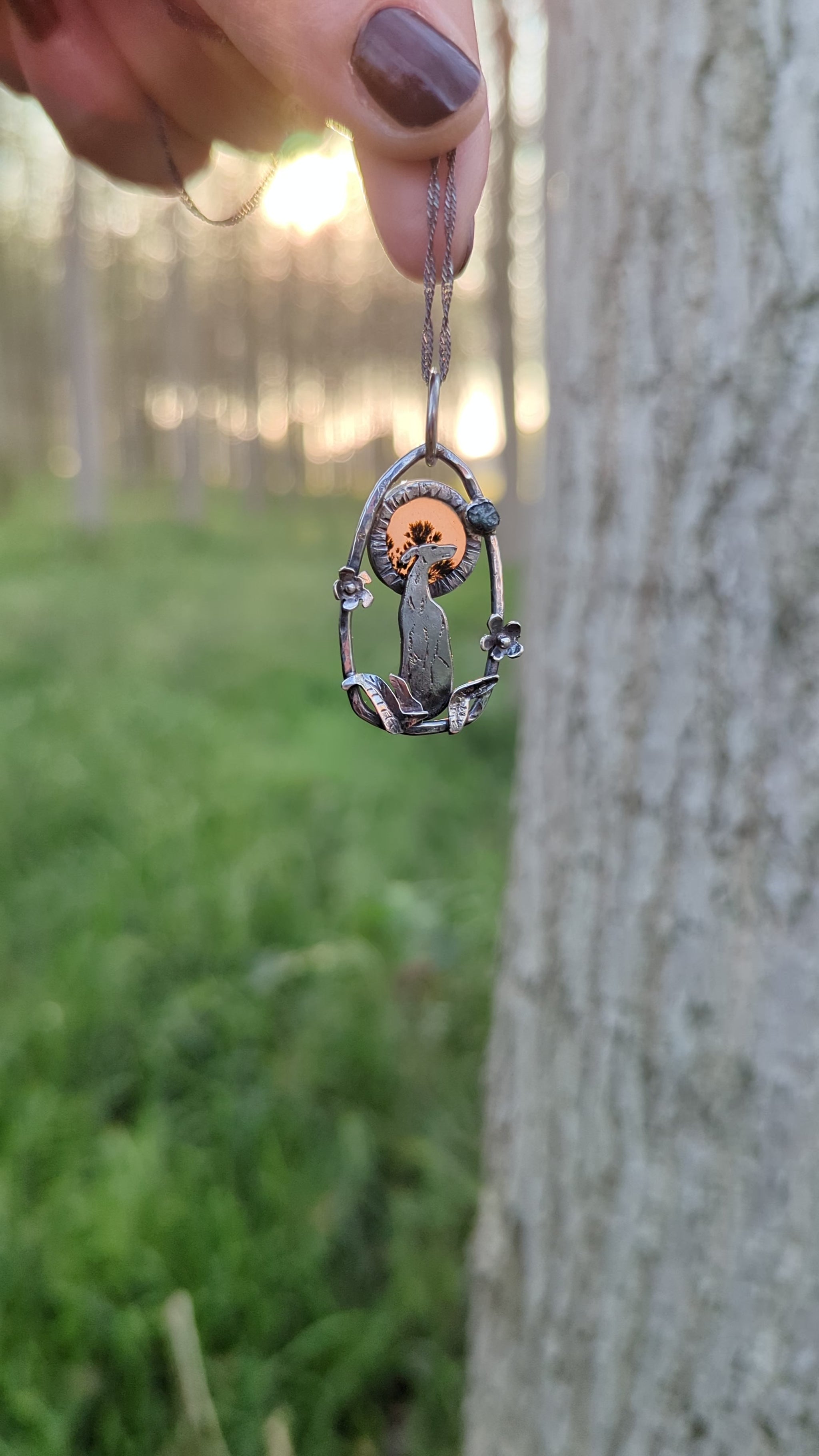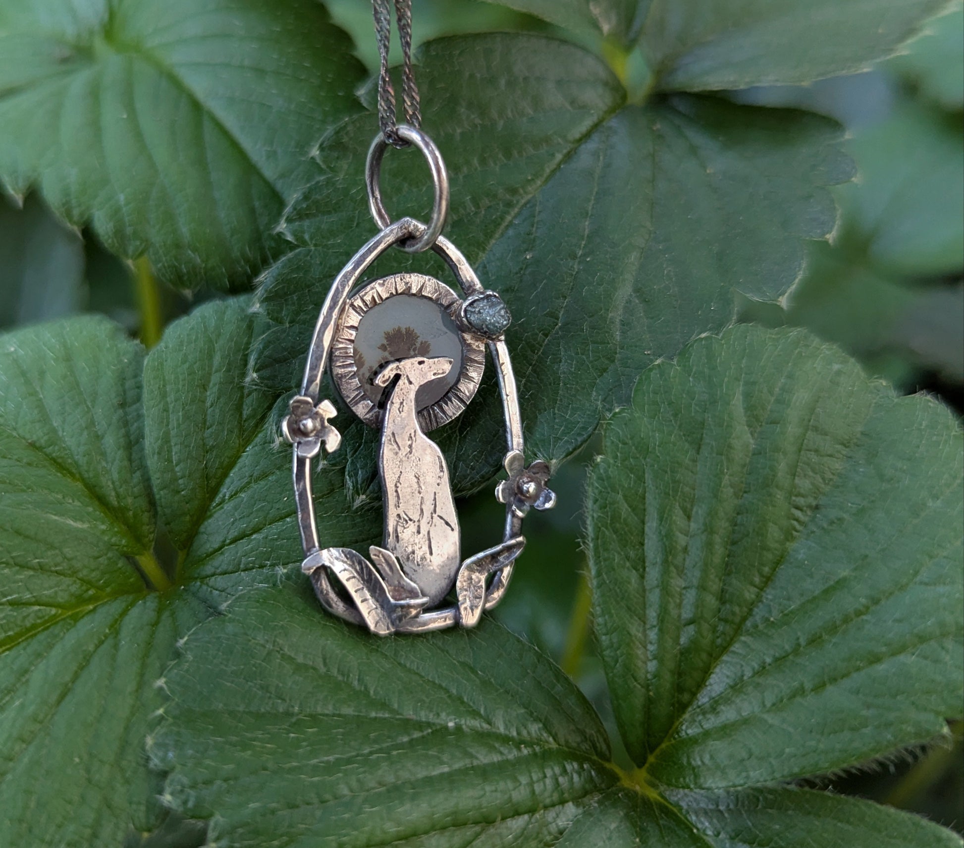 Il ciondolo in argento 925, e' arricchito da un agata dendritica che compone l'aureola del levreiro e un piccolo diamante grezzo, per simboleggiare il legame eterno e indissolumile che unisce i cani agli uomini.