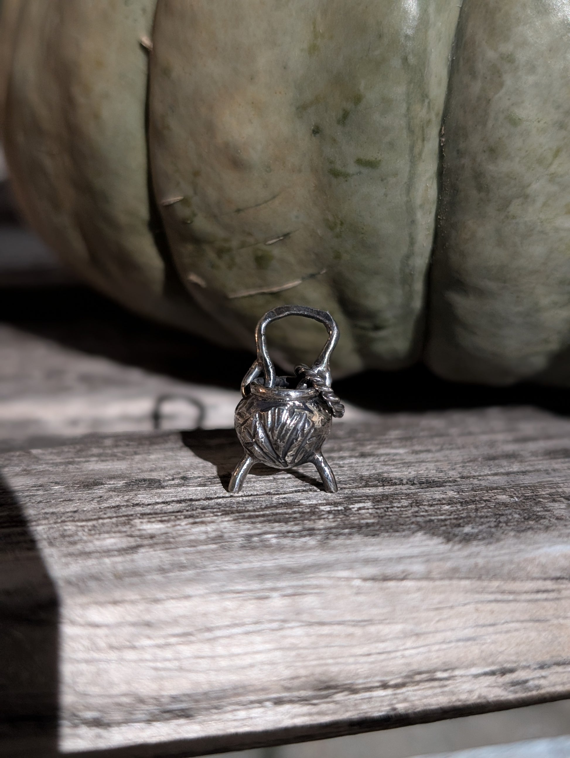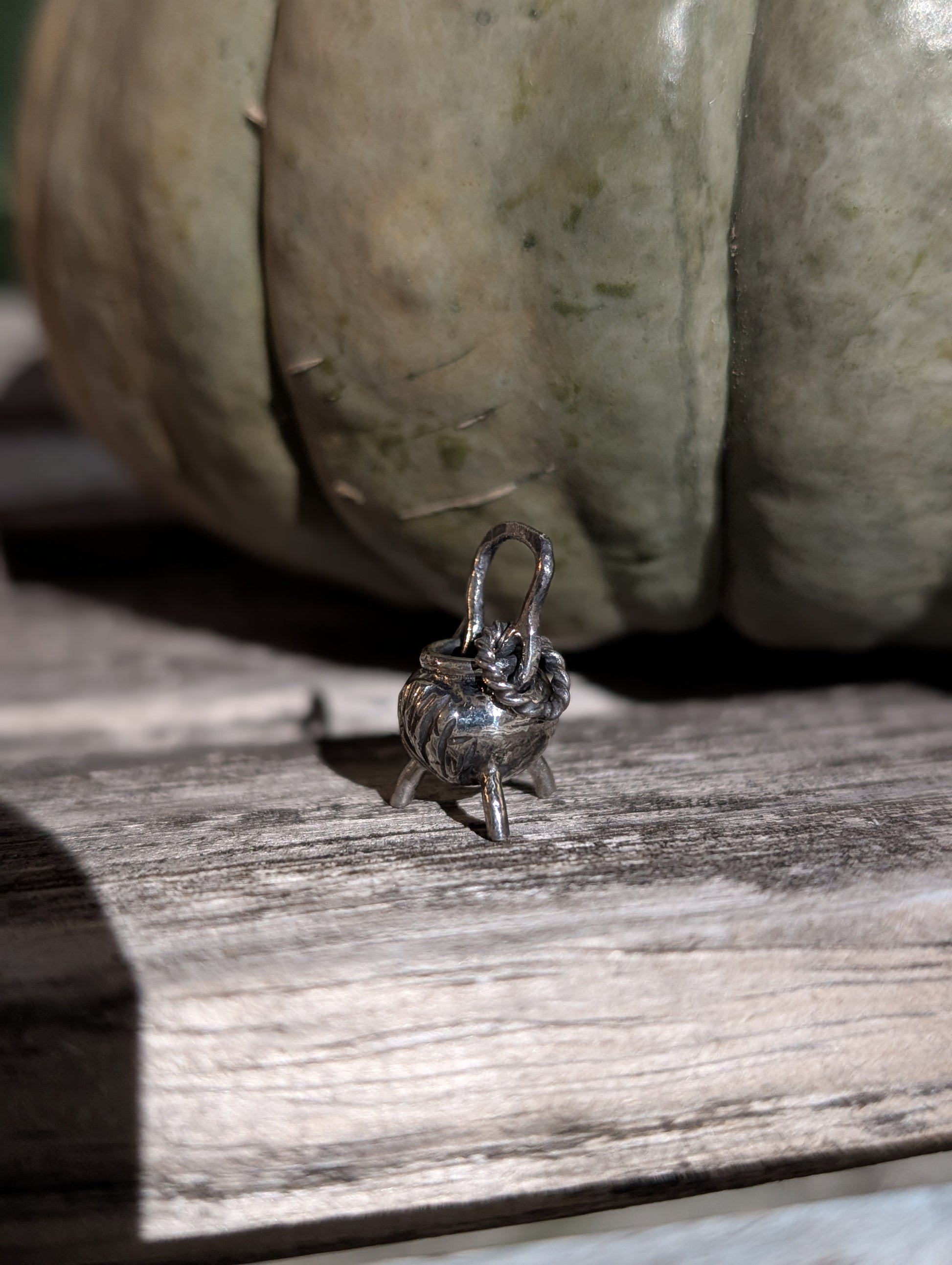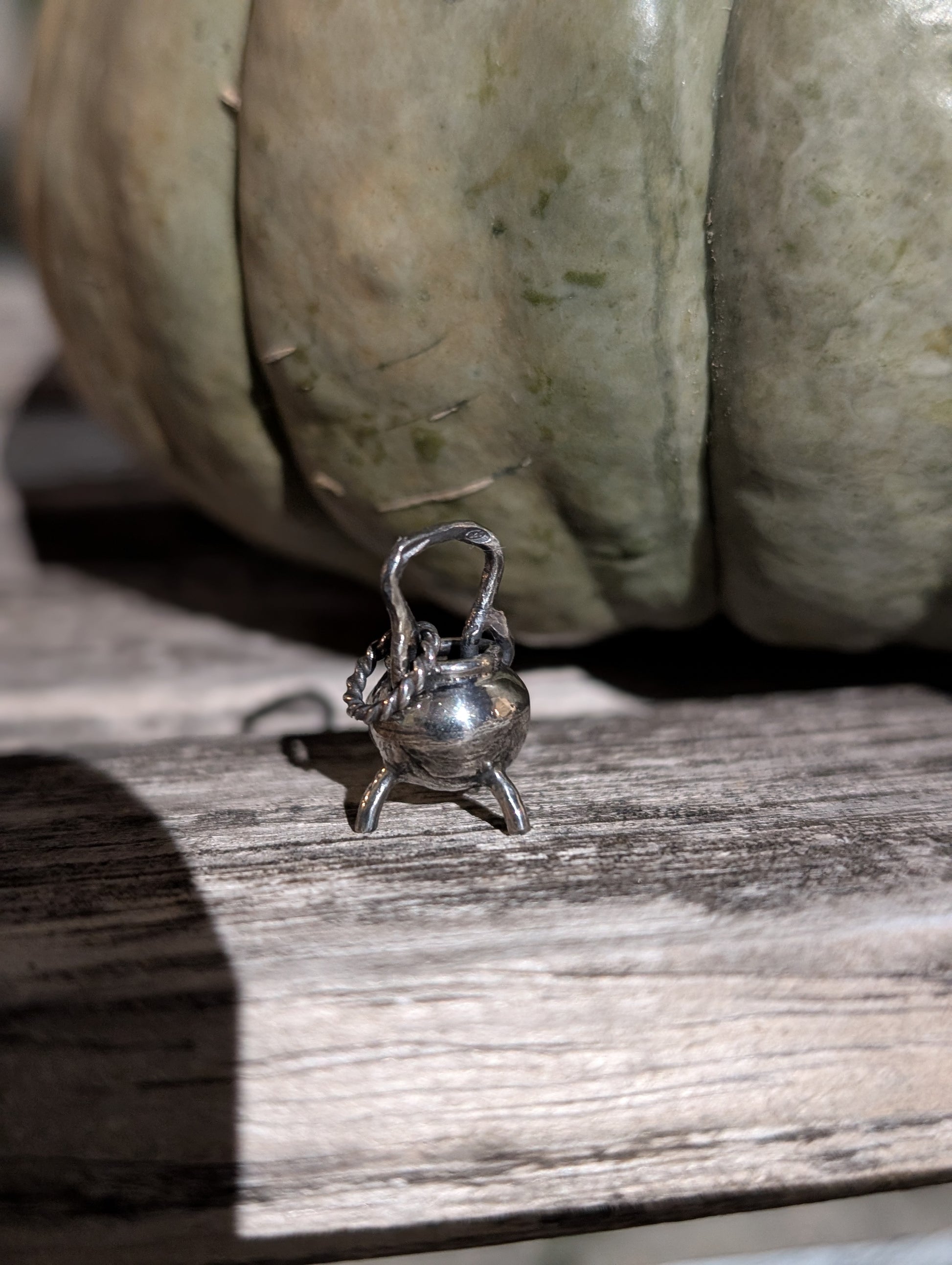 Mini calderone in argento 925, lavorato interamente, modellato da lastra e filo, h 2 cm.