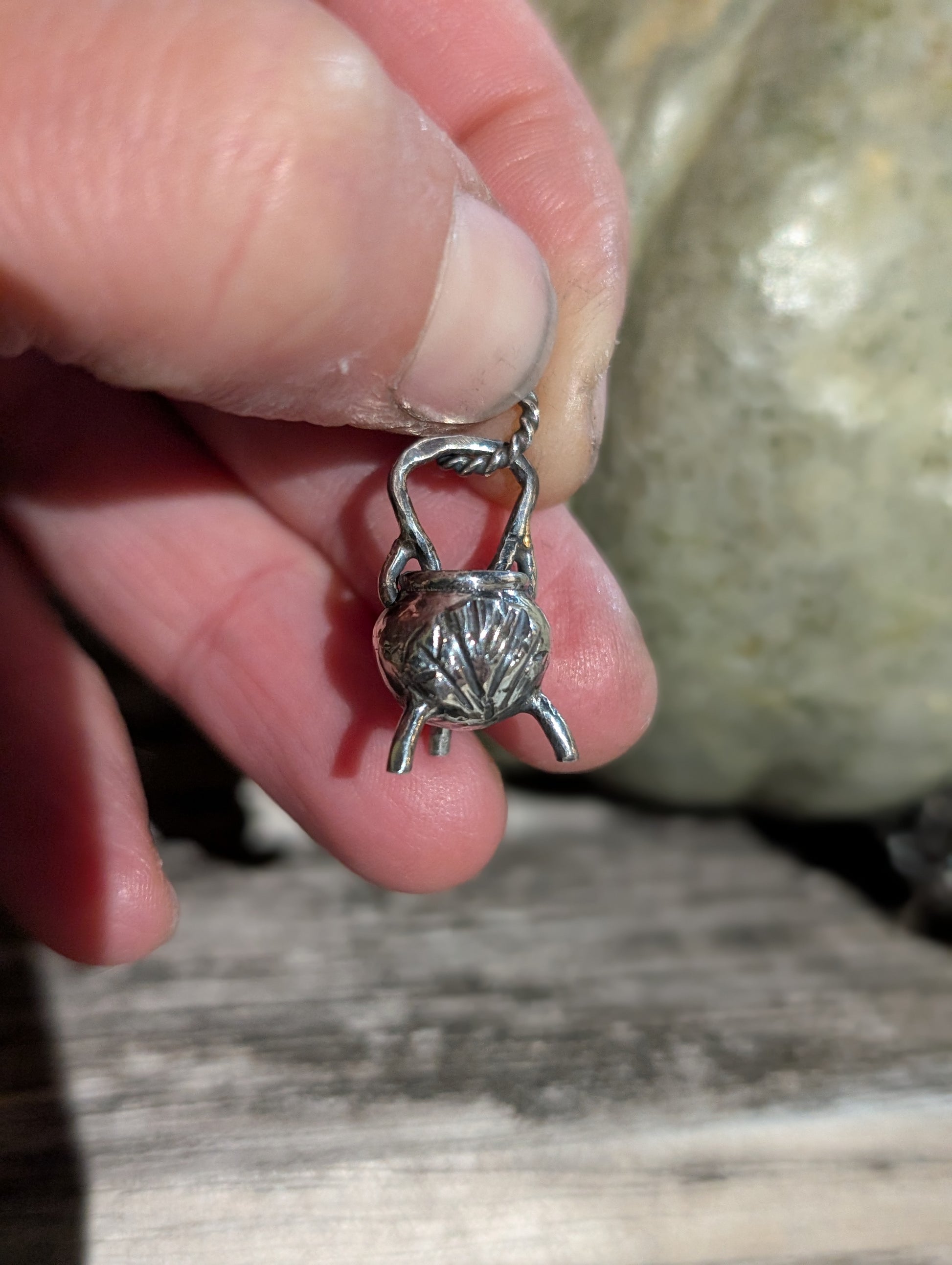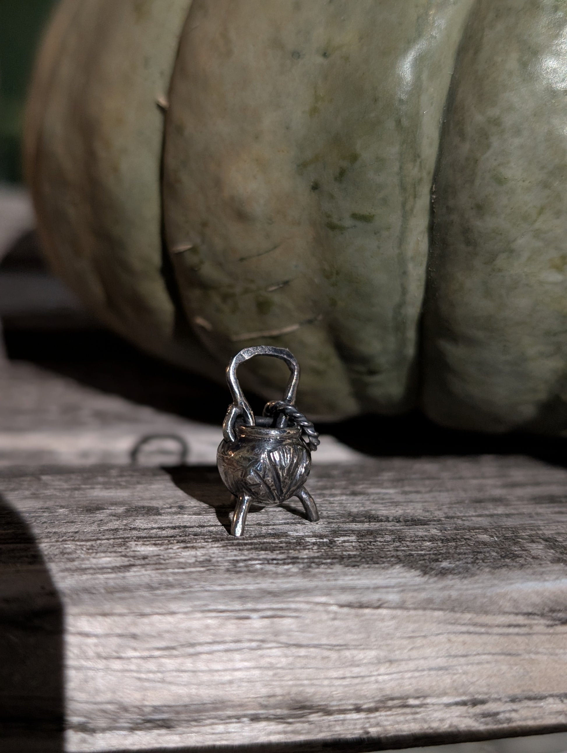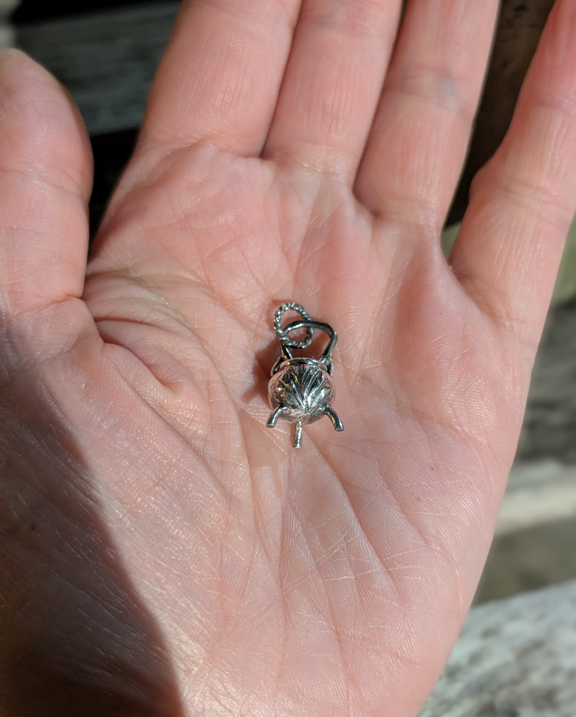Mini calderone in argento 925, lavorato interamente, modellato da lastra e filo, h 2 cm.