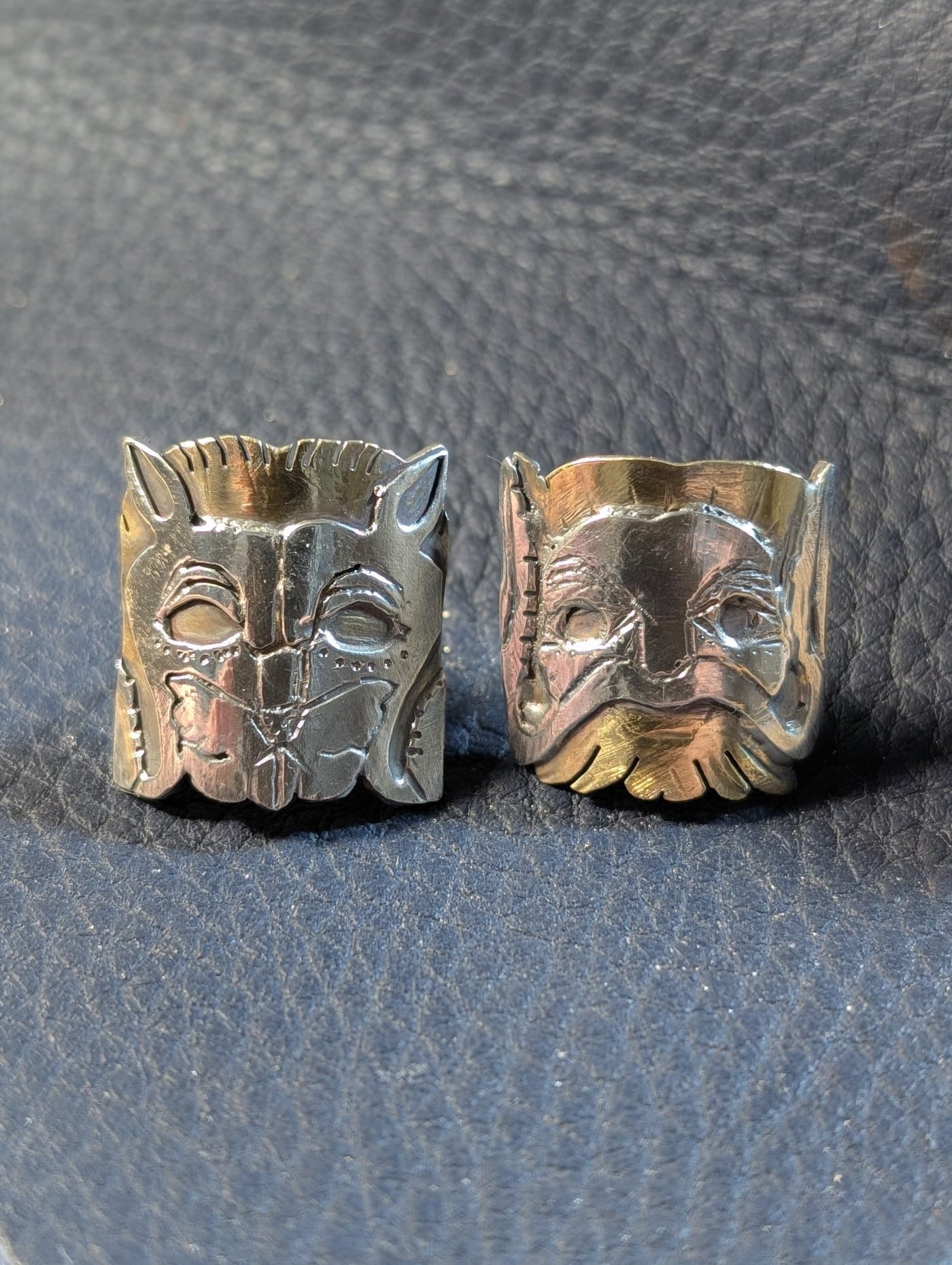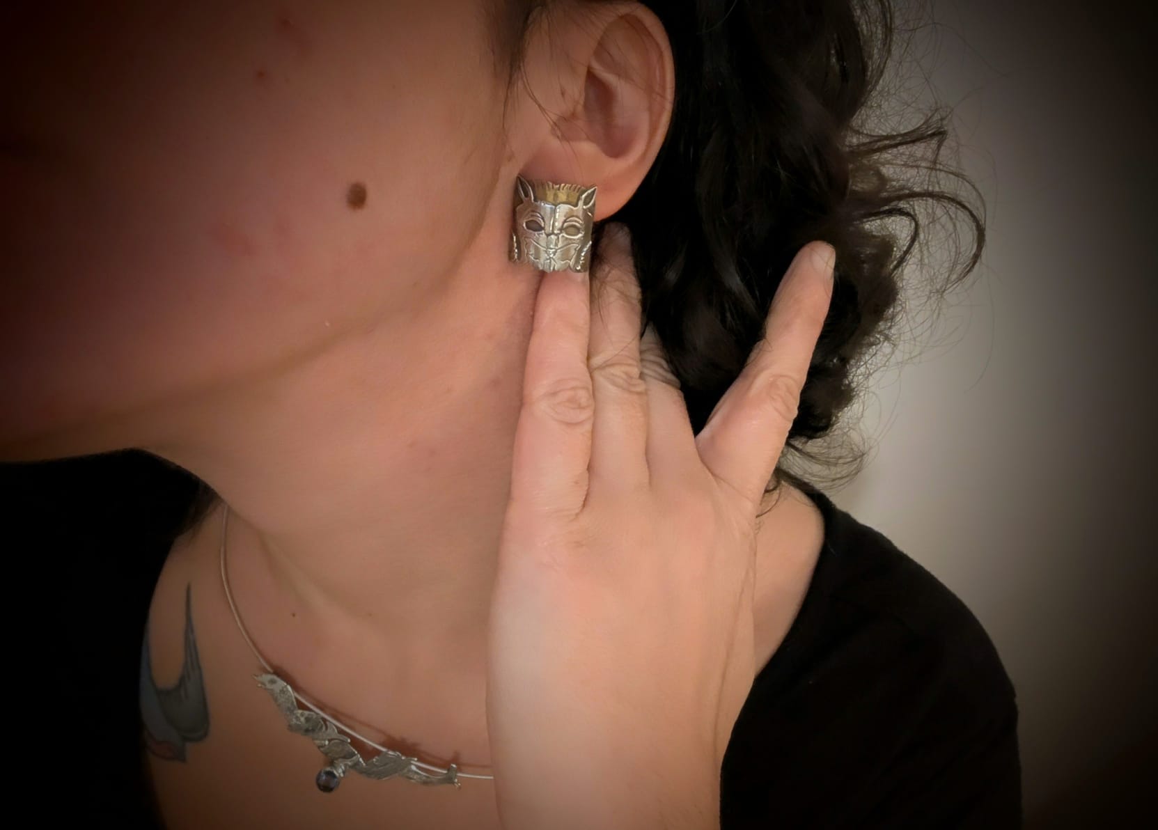 Questi orecchini in argento 925 e ottone, lavorati interamente a mano, sono stati realizzati su disegno dell'artista Gil Ferraro che, ispirandosi alle bellissime sculture dei capitelli della Basilica di San Michele maggiore di Pavia, ha rielaborato i soggetti nel suo caratteristico stile grafico, rendendoli perfetti per essere trasformati in gioielli.