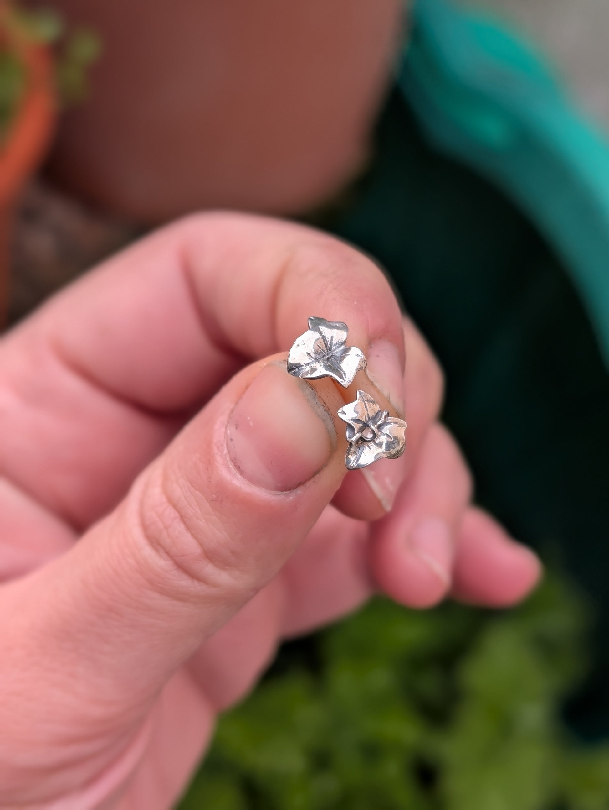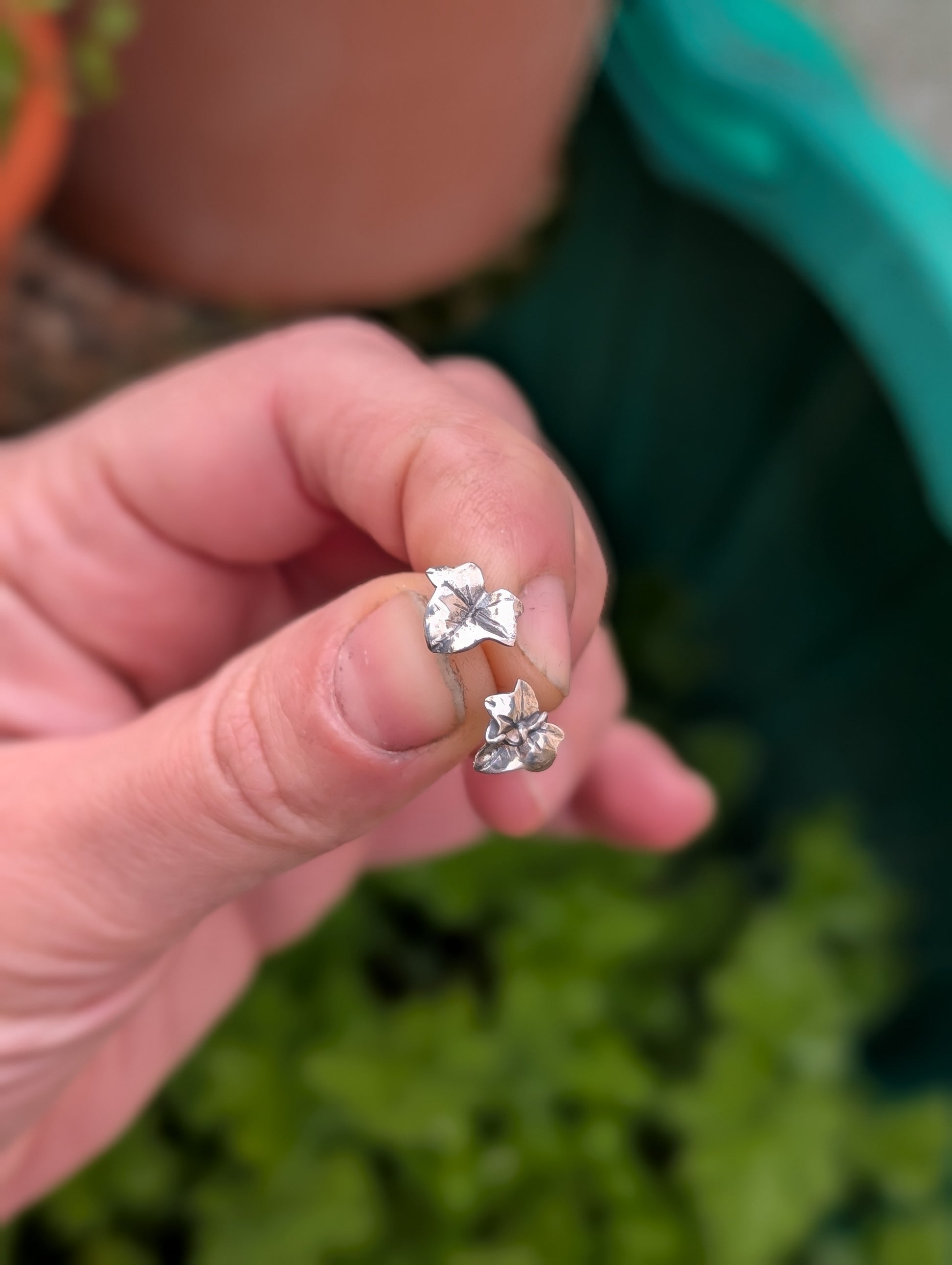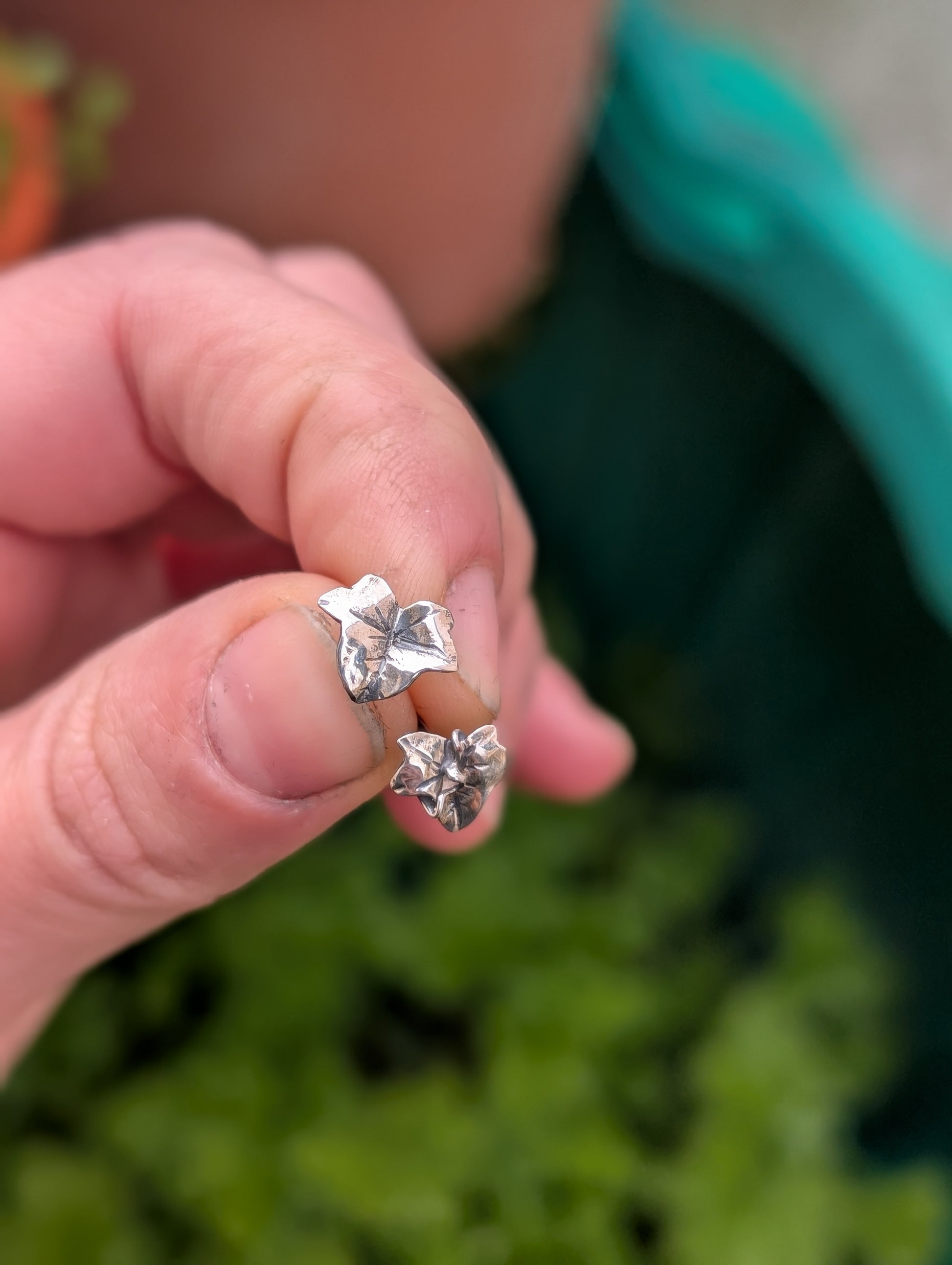 Coppia di orecchini a lobo, in argento 925, a forma di foglioline di edera.