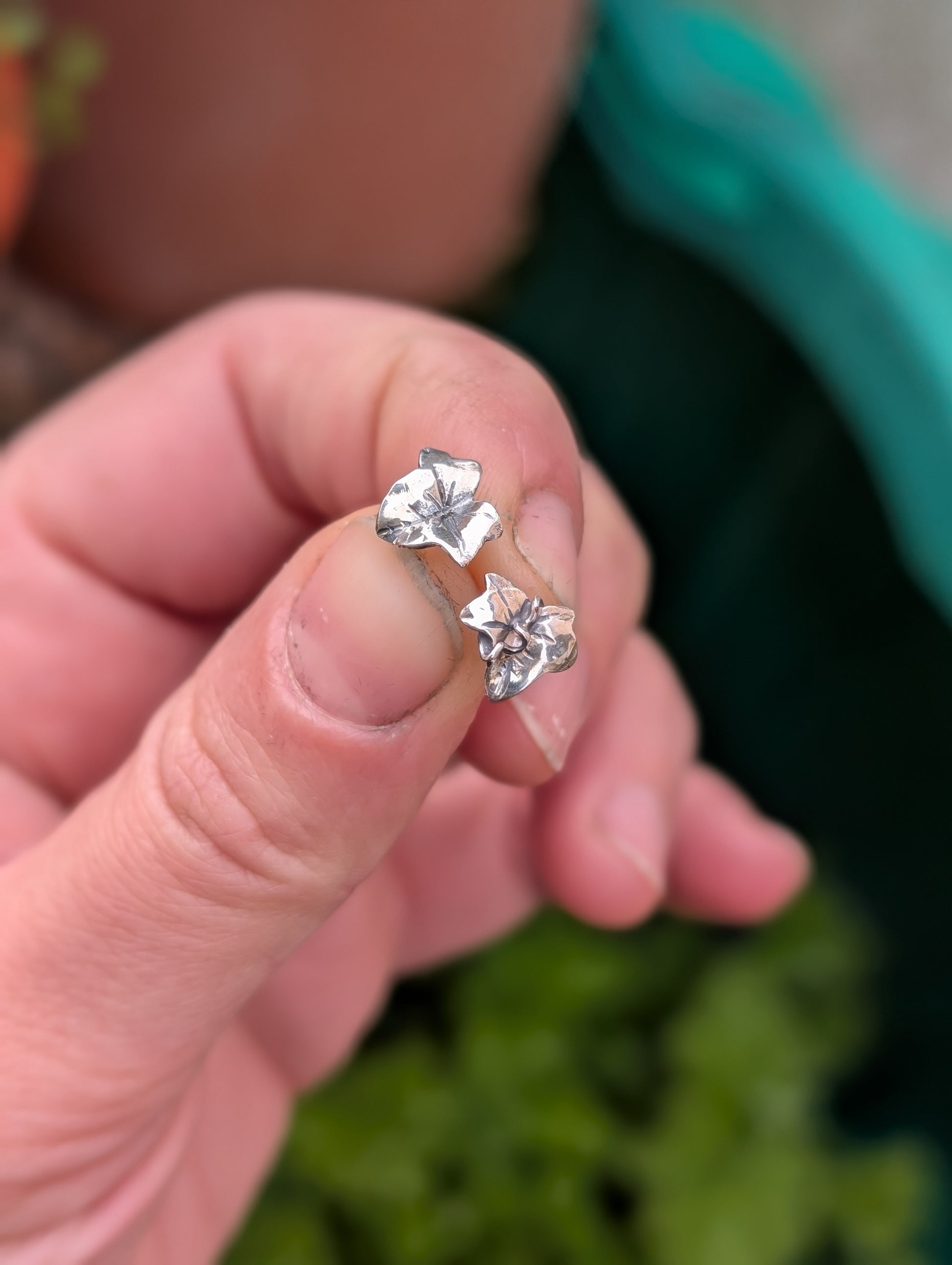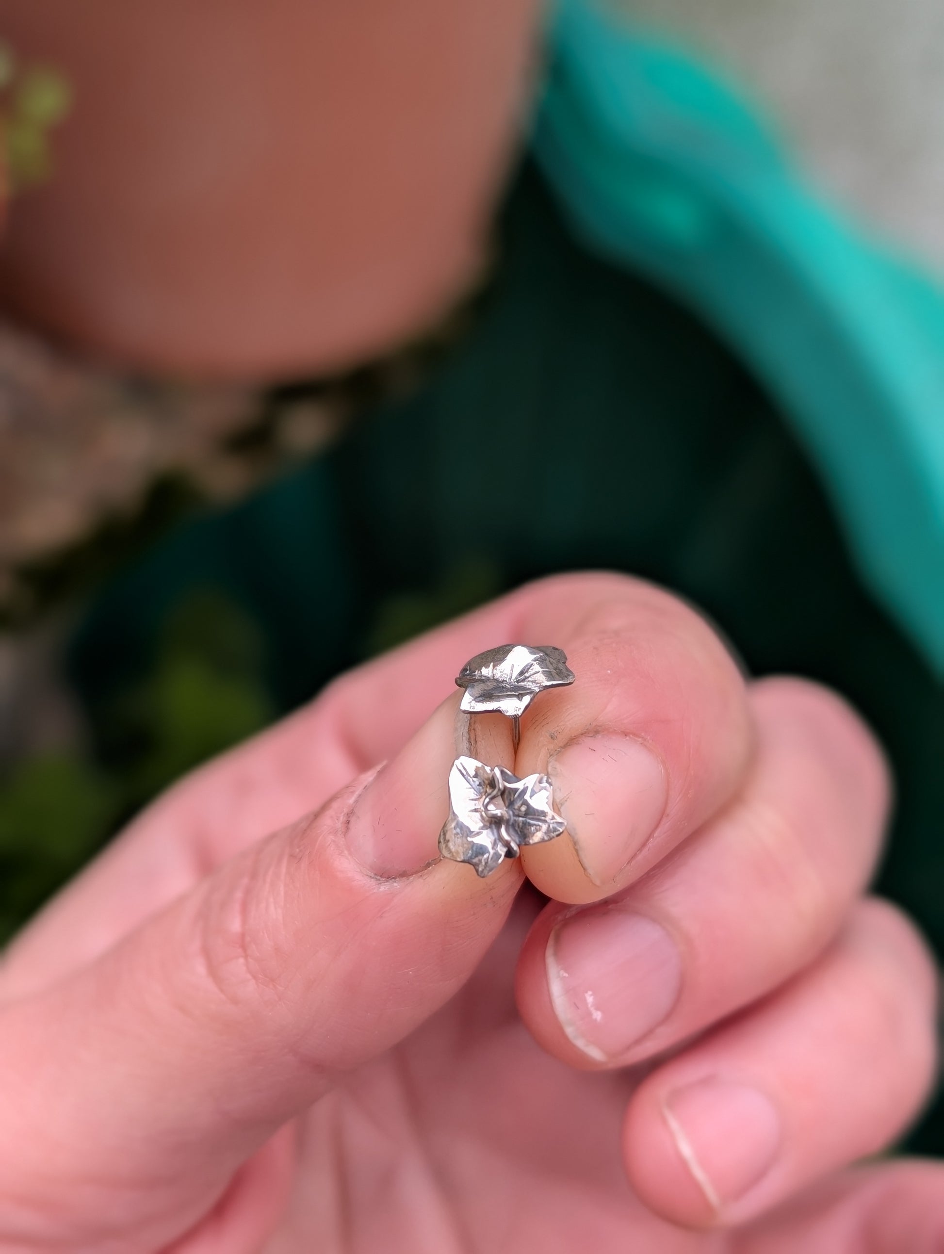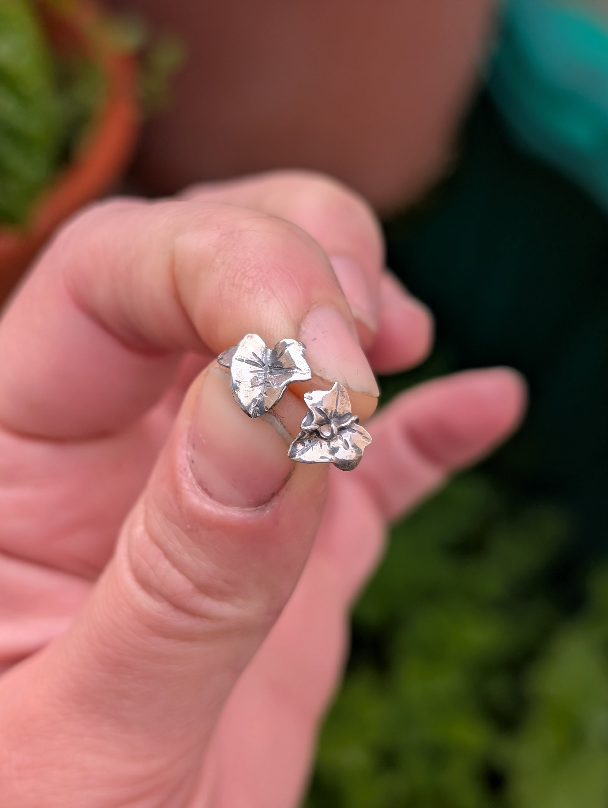 Coppia di orecchini a lobo, in argento 925, a forma di foglioline di edera.